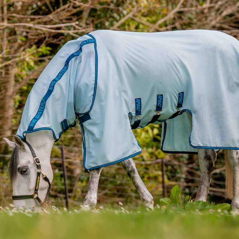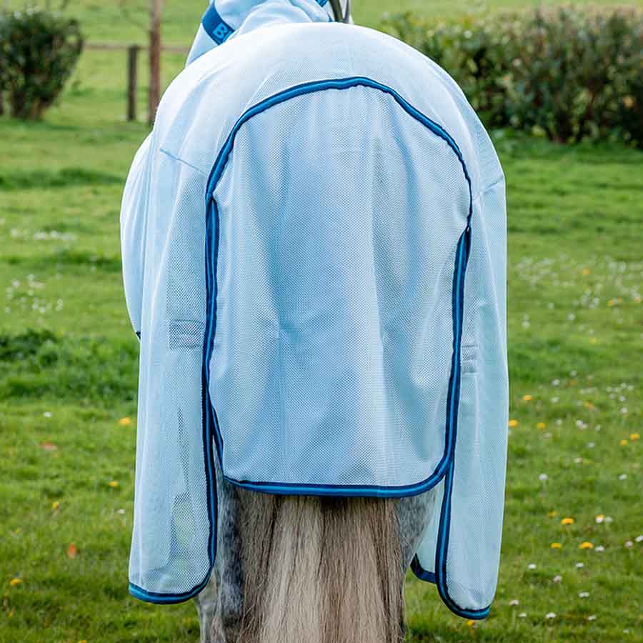 Horseware's Bug Buster, hier in Hellblau, ist eine hochwertige Fliegendecke, die wirksamen Schutz vor den starken UV-Strahlen der Sonne sowie vor Fliegen und anderen störenden Insekten bietet. Das gut belüftete Material sorgt dafür, dass das Pferd kühl und trocken bleibt, während die ausgeschnittenen Beinausschnitte und die sorgfältig gestaltete Passform maximale Bewegungsfreiheit und optimalen Komfort gewährleisten.
