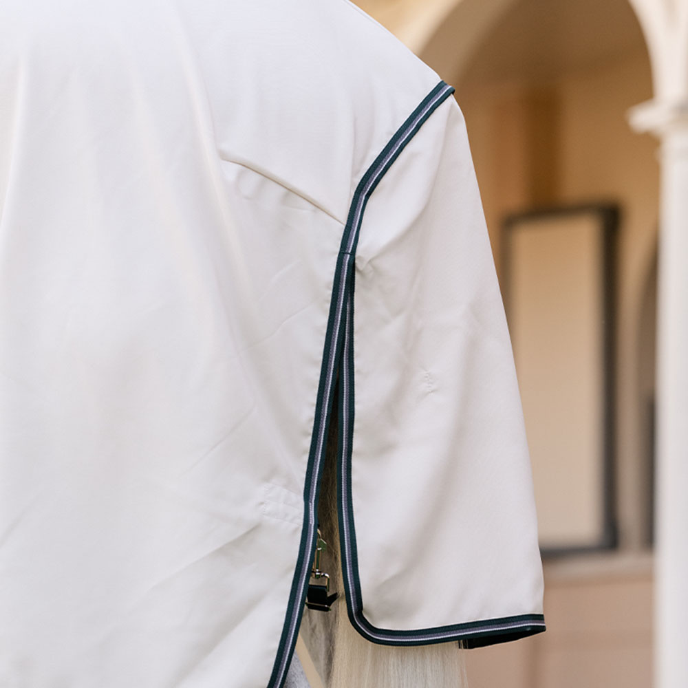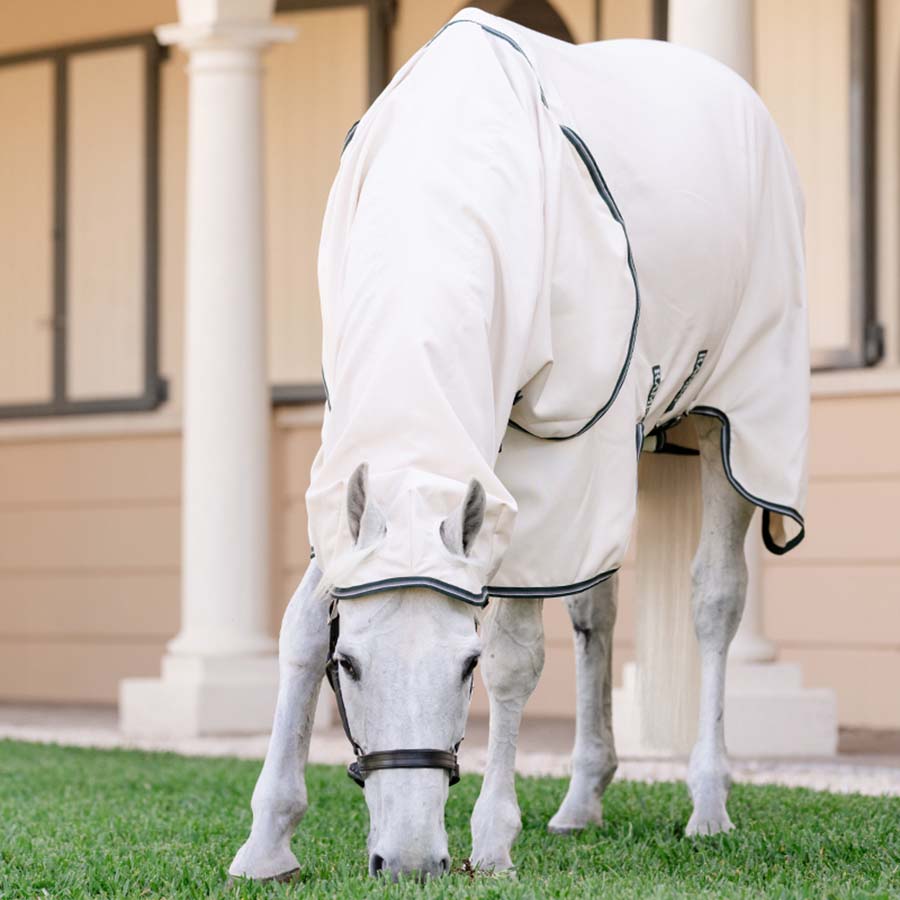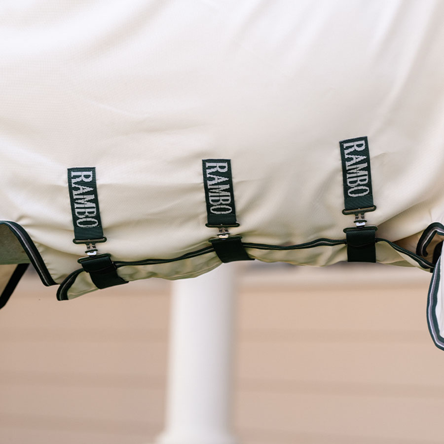 Die Rambo Hoody XL besteht aus einem hochwertigen, gut belüfteten Meshmaterial mit 1000D Ripstop und effektivem UV-Schutz. Sie ist mit einem extra großen Schweiflatz sowie einem Halsteil mit integrierter Kapuze ausgestattet, die über die Ohren reicht. Innen ist die Decke an Mähne, Schulter und Schweif mit einem seidig glatten Futter versehen, um das Risiko von Scheuerstellen und Reibung zu minimieren.