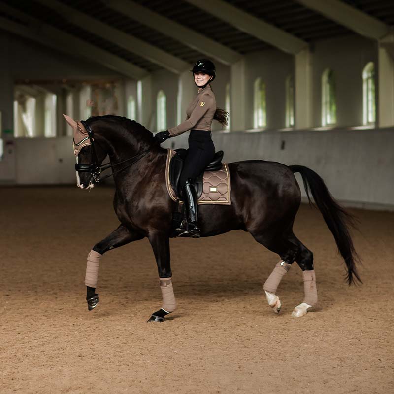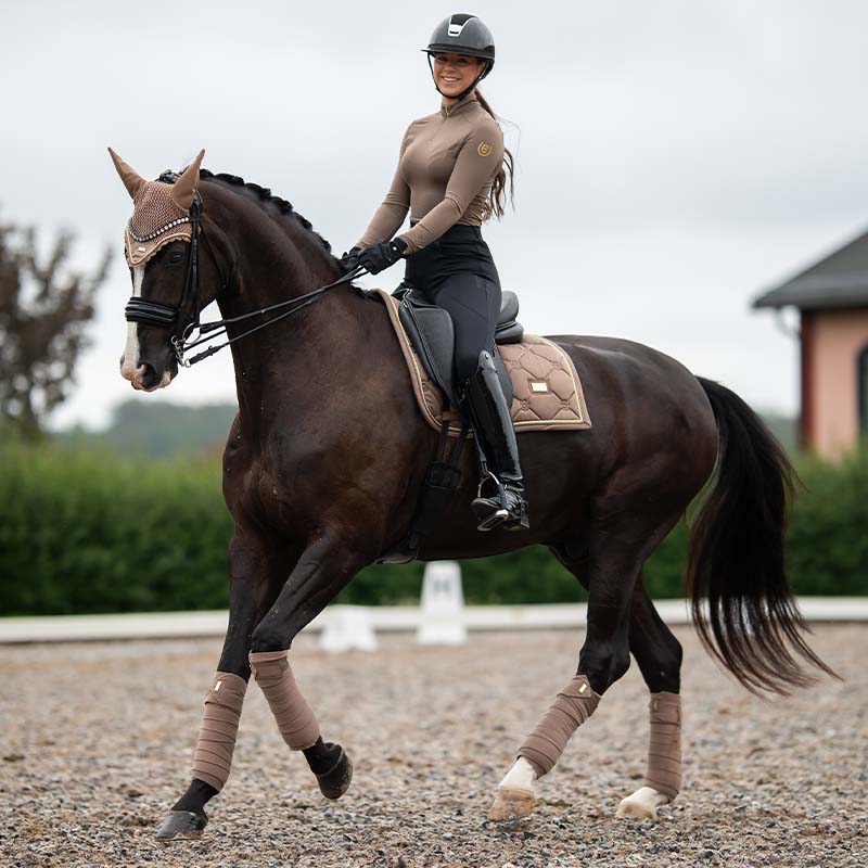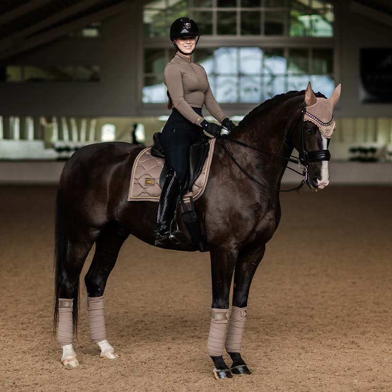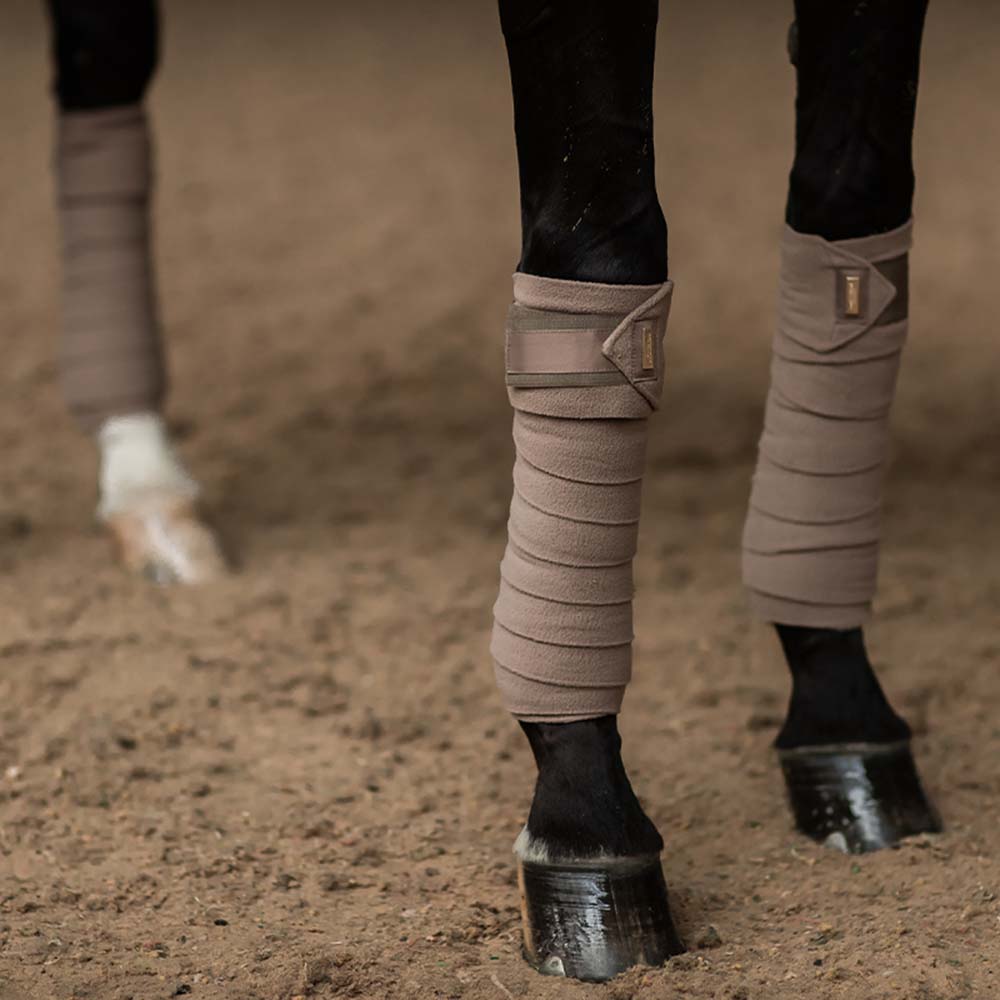 Unsere Bandagen in einem schönen champagnerbeigen Design mit goldenen Details sind sowohl stilvoll als auch funktional. Hergestellt aus 100% nicht-recyceltem Polyester bieten diese Fleecebandagen guten Schutz für die Beine Ihres Pferdes während des Trainings und Wettkampfs. Sie sind einfach anzubringen und bieten einen sicheren Sitz, was sie zu einer ausgezeichneten Wahl für den täglichen Gebrauch und formellere Anlässe macht. Kombinieren Sie sie mit dem Sattelpad aus unserer Champagne-Kollektion für einen einheitlichen und eleganten Look. Jedes Set enthält vier Bandagen, was sie praktisch und wirtschaftlich macht.
