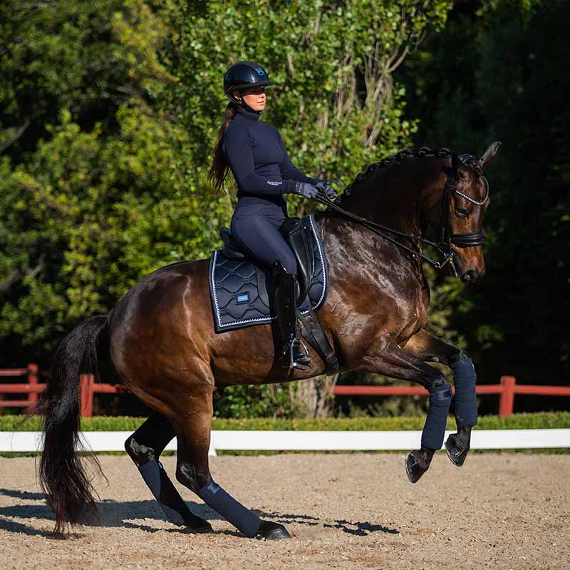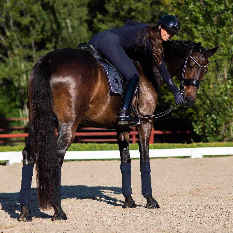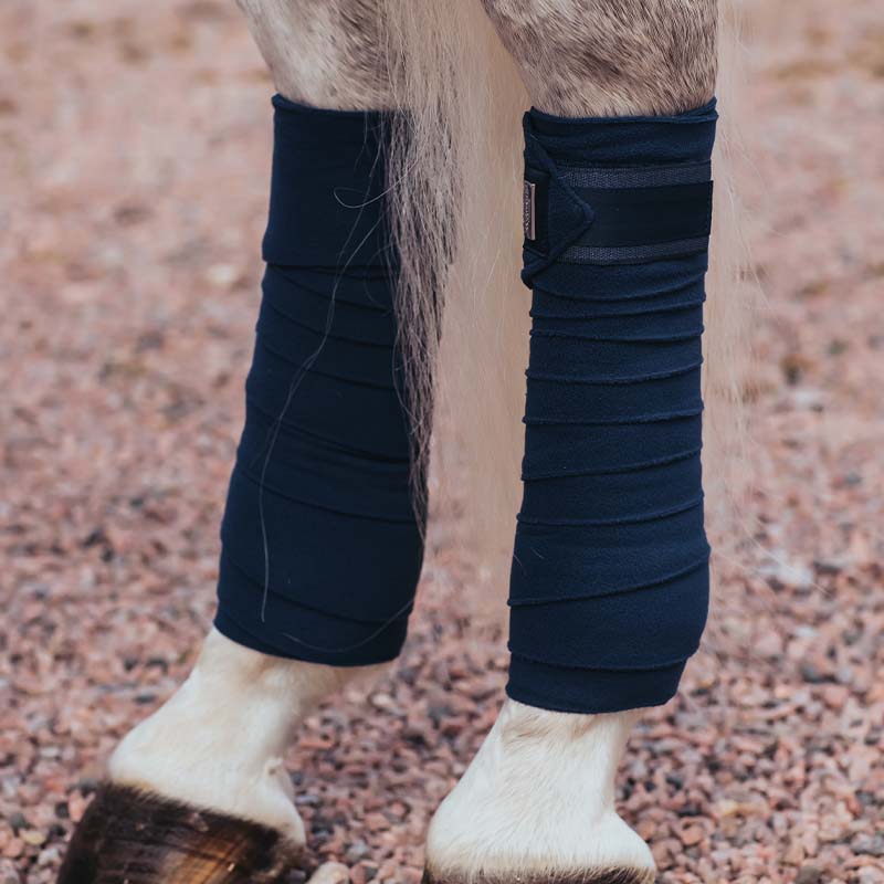 Unsere marineblauen Bandagen sind sowohl stilvoll als auch funktional. Hergestellt aus 100% nicht-recyceltem Polyester bieten sie guten Schutz für die Beine Ihres Pferdes während des Trainings und Wettkampfs. Sie sind einfach anzubringen und bieten eine gleichmäßige Kompression, die hilft, die Muskeln und Sehnen zu unterstützen. Mit ihren exklusiven, glänzenden silbernen Details und dem stilvollen ES-Logo können Sie sie leicht mit dem Schabrack aus unserer Midnight Blue-Kollektion für einen eleganten Look kombinieren. Die Bandagen werden im Set von vier verkauft, was sie praktisch für Training und Wettkampf macht.