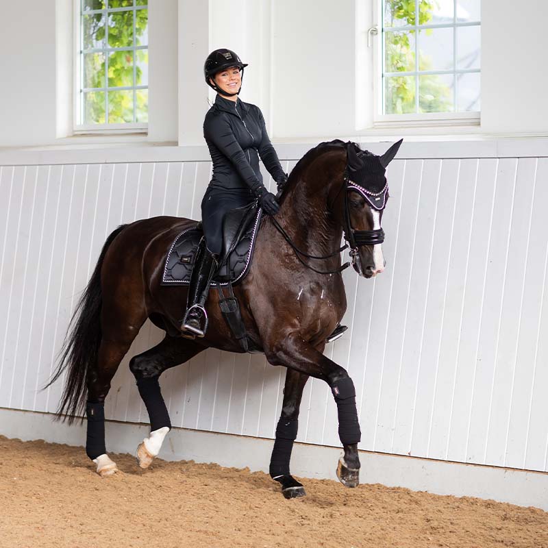 Diese elegante Haube in Black Edition ist sowohl praktisch als auch stilvoll. Sie besteht aus 100% Baumwolle und hat glänzende silberne Details. Die Haube schützt effektiv vor Insekten und reduziert Lärm, was sie ideal für Training und Wettkampf macht. Das Design verfügt über elastischen Stoff an den Ohren, um Reibung zu minimieren und den Komfort für Ihr Pferd zu erhöhen. Diese Haube passt perfekt zu dem Schabrack aus derselben Kollektion.