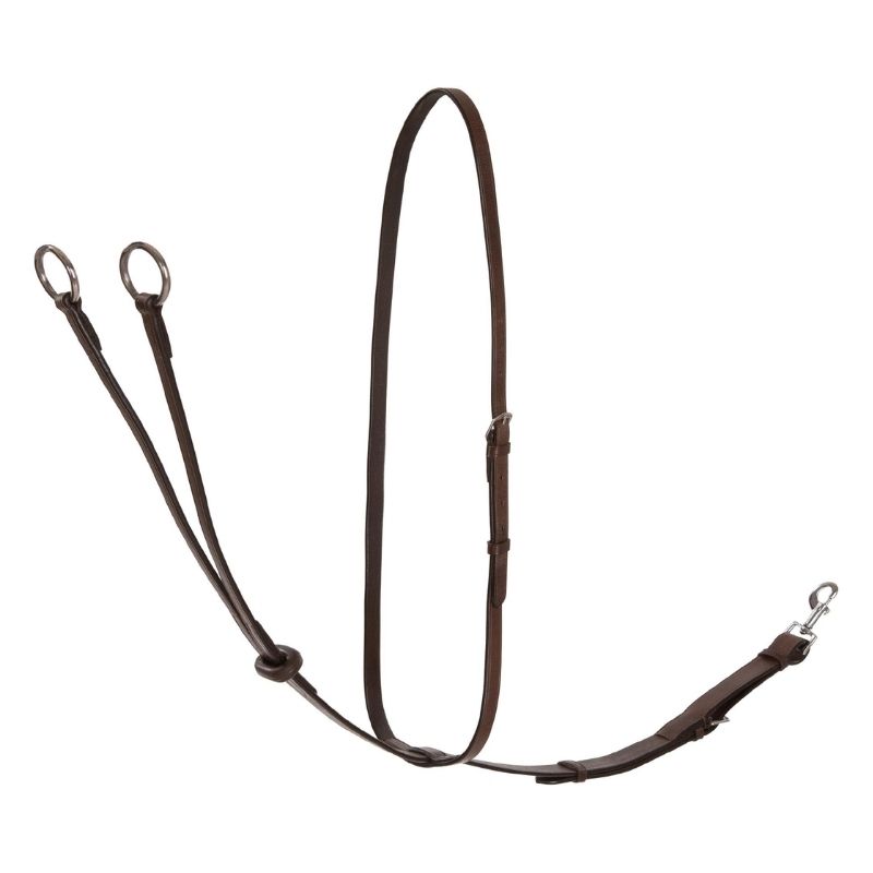 Das Lippo Selected Martingal ist aus weichem braunem Leder mit passenden Nähten gefertigt und bietet ein elegantes Erscheinungsbild. Es verfügt über silberne Schnallen und einen verstellbaren Gummistopper für zusätzliche Anpassungsmöglichkeiten. Zudem ist ein abnehmbarer Karabinerhaken an der Sattelgurtbefestigung enthalten, was die Handhabung und Anpassung erleichtert.