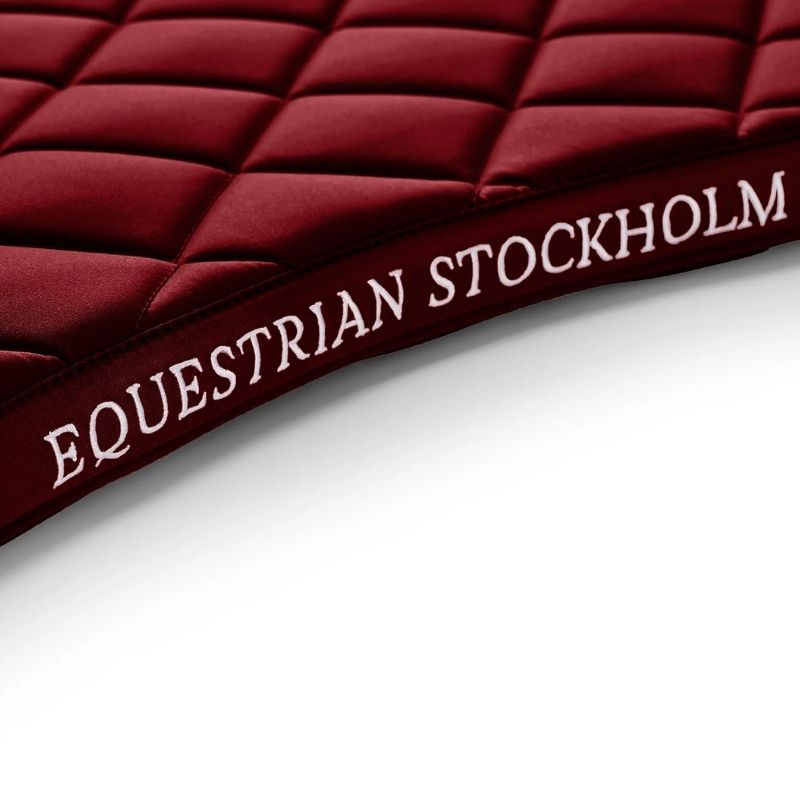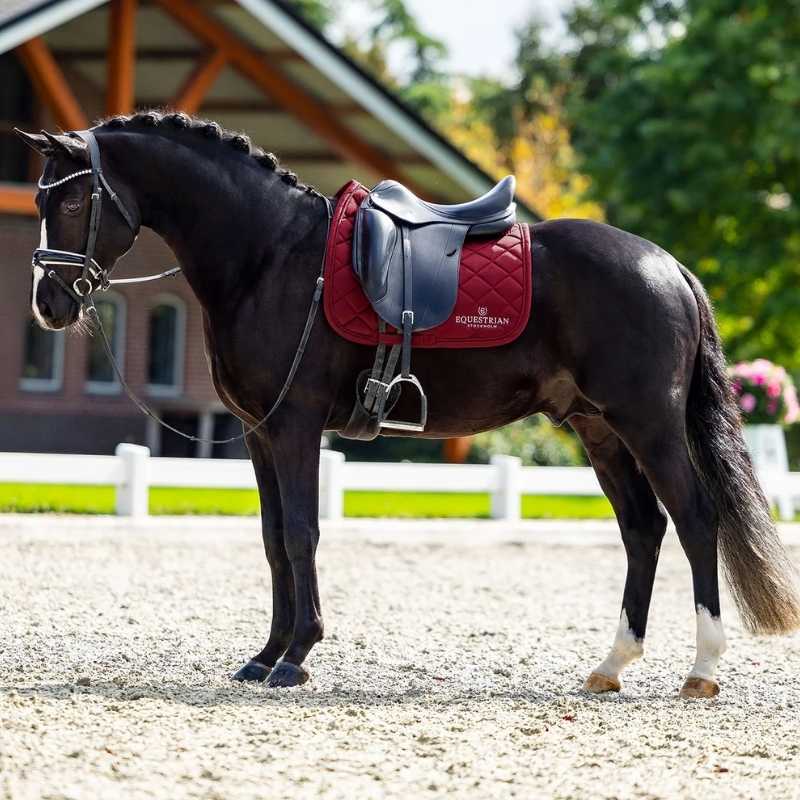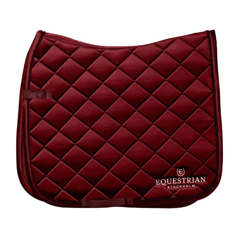 Die Dressurschabracke von Equestrian Stockholm, Modell ES Line, ist in einer eleganten Bordeaux-Farbe erhältlich. Sie ist darauf ausgelegt, Ihr Pferd kühl und trocken zu halten, dank einer High IQ Cool Comfort-behandelten Innenseite, die Feuchtigkeit effektiv ableitet und schnell trocknet. Die Schabracke ist mit Einfassband, Paspel und weißer Stickerei verziert, was ihr ein elegantes Aussehen verleiht. Klettverschlüsse und ein Gurtband sorgen dafür, dass die Schabracke sicher an Ort und Stelle bleibt. Hergestellt aus strapazierfähigem Polyester, ist sie für regelmäßiges Training ausgelegt.