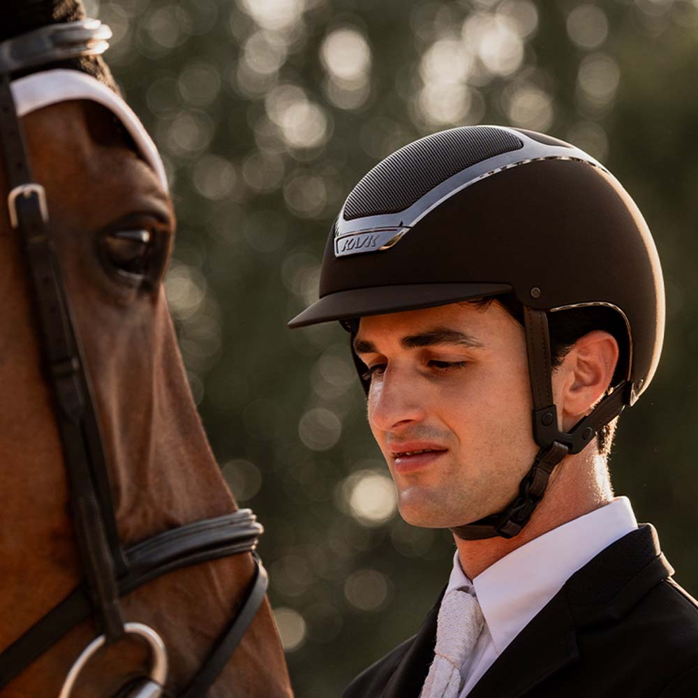 KASK Dogma Chrome, hier in der Farbe Espresso Brown, ist ein hochwertiger Reithelm mit Standardvisier, der Sicherheit, Komfort und ein elegantes, modernes Design vereint. Die matte Oberfläche wird durch dezente Chromdetails Ton-in-Ton mit der Schale ergänzt und sorgt für ein stilvolles Erscheinungsbild.