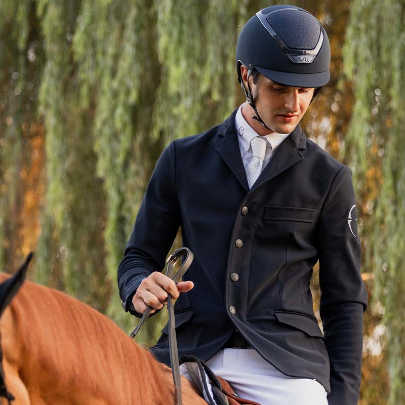 KASK Dogma Chrome, hier in Marineblau, ist ein hochwertiger Reithelm mit Standardvisier, der Sicherheit, Komfort und ein elegantes, modernes Design vereint. Die matte Oberfläche wird durch dezente Chromdetails Ton-in-Ton mit der Schale ergänzt und sorgt für ein stilvolles Erscheinungsbild.