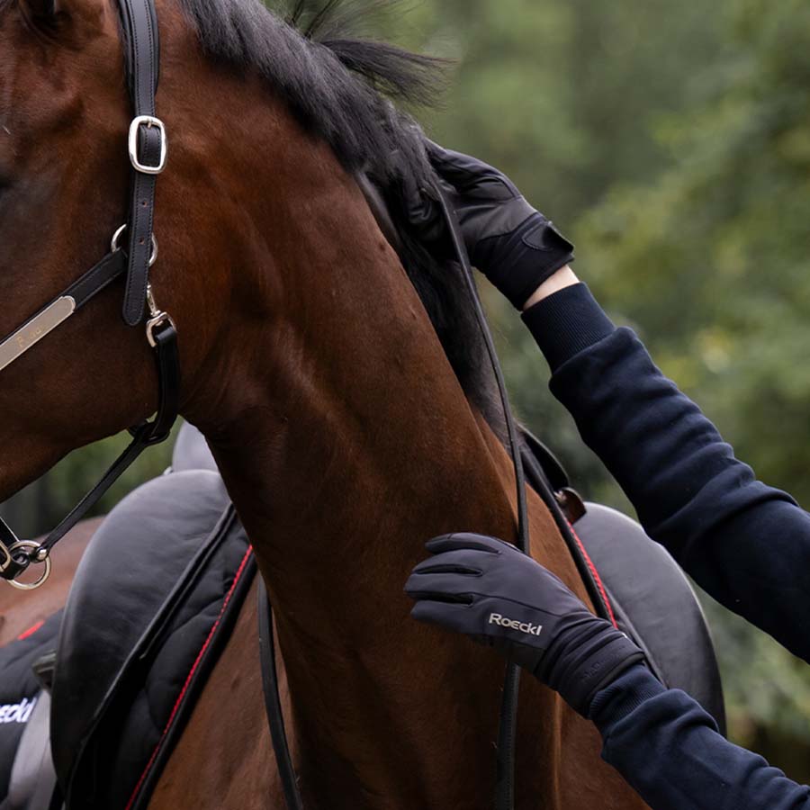 Die Winsford Winterreithandschuhe sind ideal für kalte und regnerische Tage im Stall oder auf dem Pferd. Diese schwarzen Unisex-Handschuhe verfügen über einen schlanken ComfortCut und ein elastisches VaporFlex-Laminat für eine perfekte Passform, die den Bewegungen der Hand ohne Spannung folgt. Der Handrücken besteht aus Duradeo, einem robusten und wasserdichten synthetischen Wildledermaterial, das einen rutschfesten Griff für präzises Zügelhandling bietet. Die ROECKL-Tec Membran hält die Hände bei rauem Wetter trocken, während das weiche Easy-Dry Futter zusätzliche Wärme und Komfort bietet. Touchscreen-kompatible Daumen und Zeigefinger ermöglichen die Nutzung von Smartphones, ohne die Handschuhe auszuziehen.