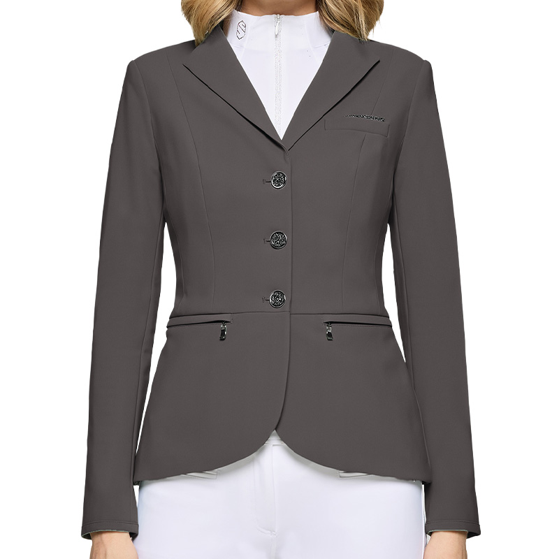 Das Samshield Victorine Crystal Fabric ist ein graues, hochwertiges Turniersakko mit figurbetonter Passform und voller Bewegungsfreiheit. Es besteht aus einem italienischen Material mit Stretch, hoher Atmungsaktivität und schnelltrocknenden Eigenschaften, was auch an intensiven Turniertagen für hohen Komfort sorgt. Die Innenseite ist mit einem dünnen, elastischen Futter ausgestattet.