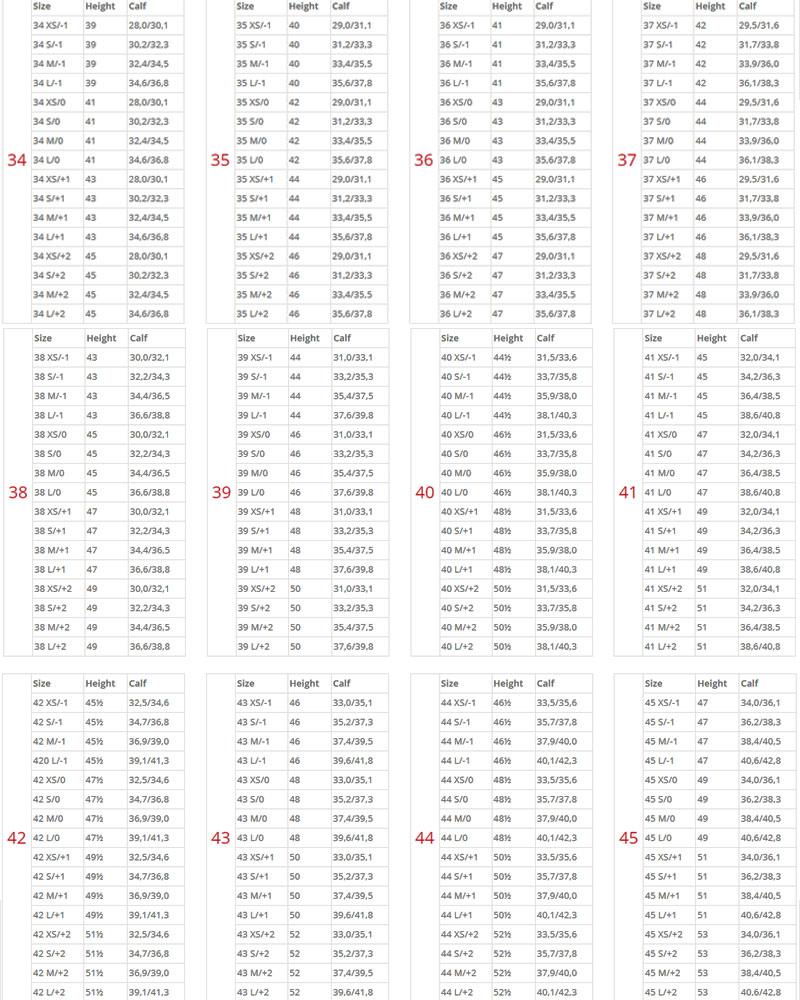 - Finden Sie Ihre Größe in der Tabelle unter den Bildern oben. Beispiel: Schuhgröße 37, Wadenumfang 32,1 cm, Höhenmaß 44 cm, dies ergibt in der Tabelle Größe 37 S/0.