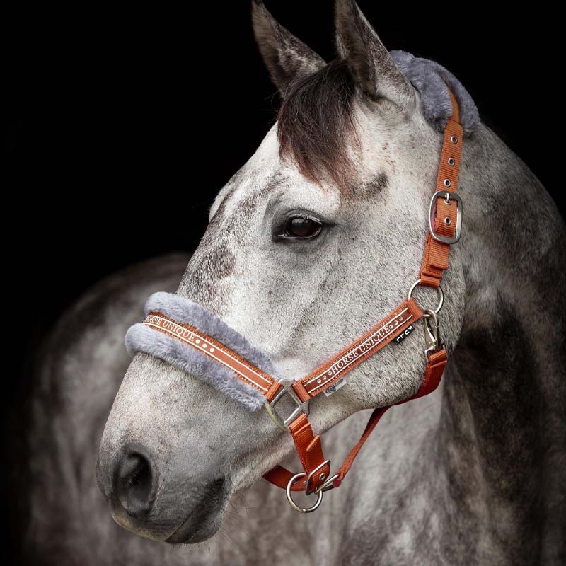 Das Halfter mit Fleece von Horse Unique besteht aus strapazierfähigem Polypropylen und verfügt über weiches Fleece an Nase und Nacken für zusätzlichen Komfort. Es ist mit Steinen an den Backenstücken und dem Nasenriemen verziert, was einen stilvollen Akzent setzt. Der Kopfstück und der Nasenriemen sind mit matten Silber-Schnallen verstellbar, sodass die Passform leicht an Ihr Pferd angepasst werden kann.