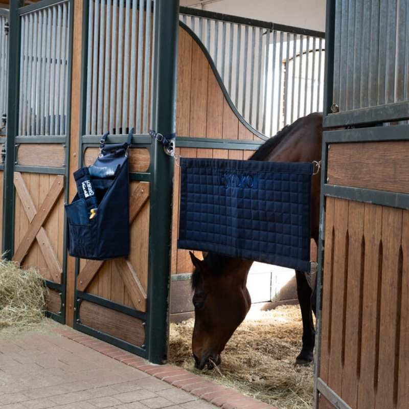 Der Eskadron Boxenstop Short ist ein praktischer und gepolsterter Boxenvorhang in Marineblau, der dafür entwickelt wurde, an der Öffnung der Boxentür befestigt zu werden. Er bietet dem Pferd eine komfortable und sichere Abgrenzung und ermöglicht gleichzeitig eine bessere Luftzirkulation und Sicht als eine geschlossene Tür. Das gesteppte Design sorgt für zusätzliche Stabilität und Haltbarkeit, während die verstellbaren Riemen eine einfache und sichere Befestigung in verschiedenen Stallumgebungen ermöglichen. Mit seinen Maßen von 95 x 50 cm ist er leicht zu handhaben und ideal für den täglichen Gebrauch geeignet.