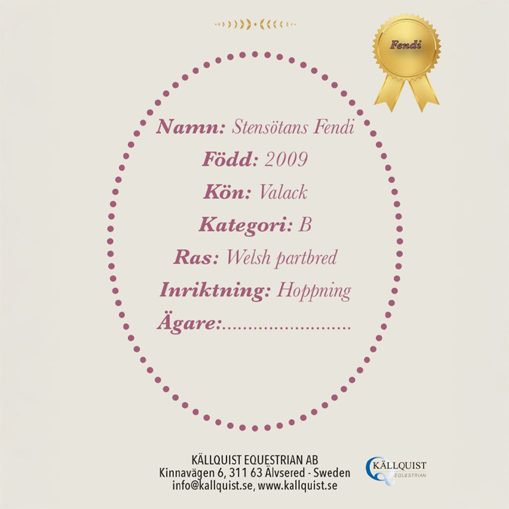 Fendi ist ein palominofarbenes Steckenpferd mit weißer Blesse und basiert auf der Rasse Welsh Partbred. Das Steckenpferd besteht aus Polyester, mit Mähne und Stirnfransen aus Garn, die sich gut flechten lassen. Der Stab besteht aus Aspenholz – ein leichtes Holz mit guter Balance beim Reiten.